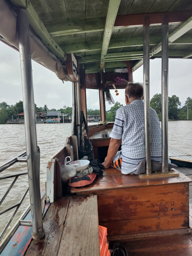 Une plateforme flottante au bout, et service 5 étoiles pour 40bht (1.-) et 0 minutes d’attente pour prendre un petit bateau à moteur dirigé par papy Jean-Paul Thaï (4 dents de traviole et le reste n’a pas tenu), qui nous fait traverser la rivière jusqu’à Bang Krachao. Comme on s’y est pris tôt il se trouve qu’on est les seuls sur le bateau.