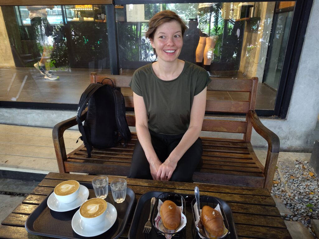 On marche quelques centaines de mètres avant de tomber sur un charmant petit café où on se pose pour prendre une spécialité et un flat white de gros bobo. Pour les ploucs, c’est comme un cappuccino mais en plus branché.