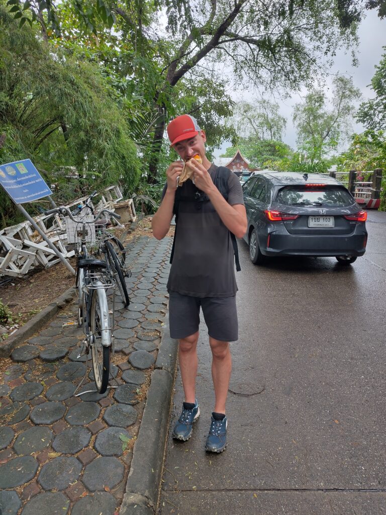 On reprend le vélo pour sortir du parc après un dernier petit tour sous la pluie et bien sûr quand on sort la pluie s’arrête, on commence à sécher et on décide de continuer à explorer l’île en dehors du parc. Les vélos branlottent mais tiennent bon jusqu’au marché flottant (il n’y a de flottant que le nom). Nous achetons des brioches fourrées à on-ne-sait-pas-quoi mais c’est bon 😋.