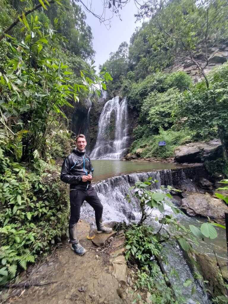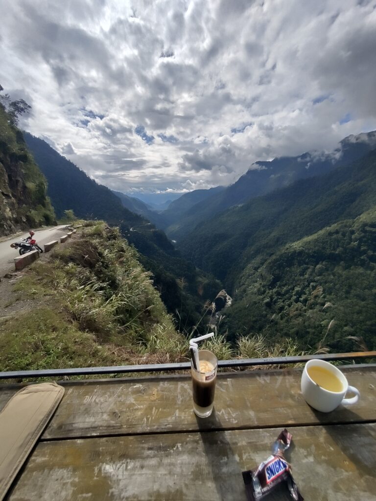 Nous avalons les km de routes sinueuses avec des paysages magnifiques. Une petite halte en haut d’un col pour un café au lait de coco avec vue. Il y a même le soleil qui nous réchauffe quelques minutes.