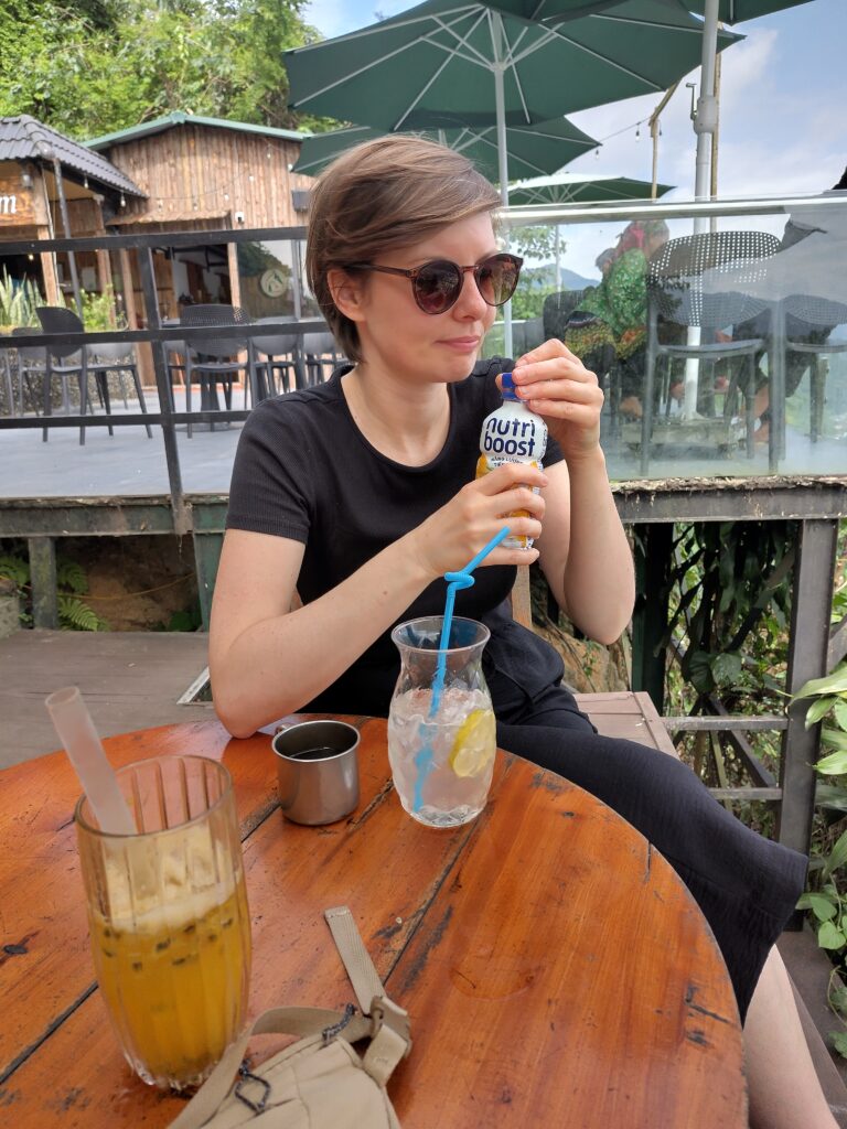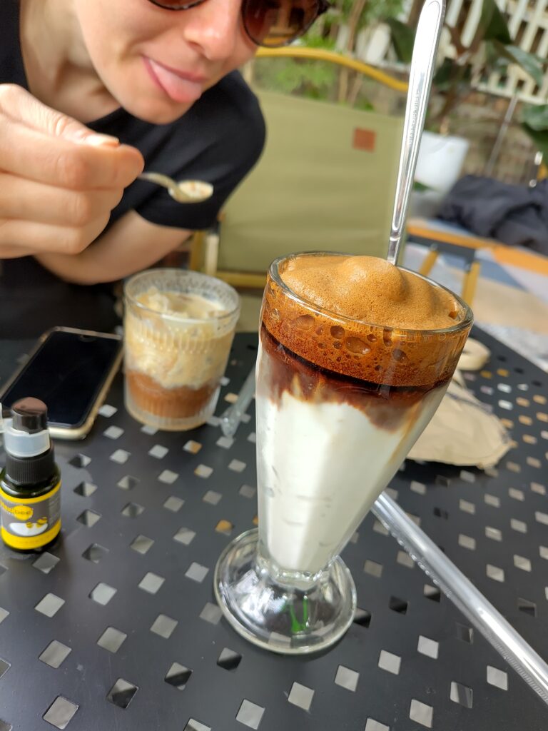 Avant de partir, nous avons encore jusqu’en début d’aprèm à Ha Giang. Après une nuit compliquée par la fièvre et l’humidité froide pesante de la chambre, le réveil est difficile. Nous nous prenons un café glacé en guise de petit déjeuner (ça devient gentiment une habitude de ne pas manger 😅). Le froid fait du bien pour la gorge ☺️.