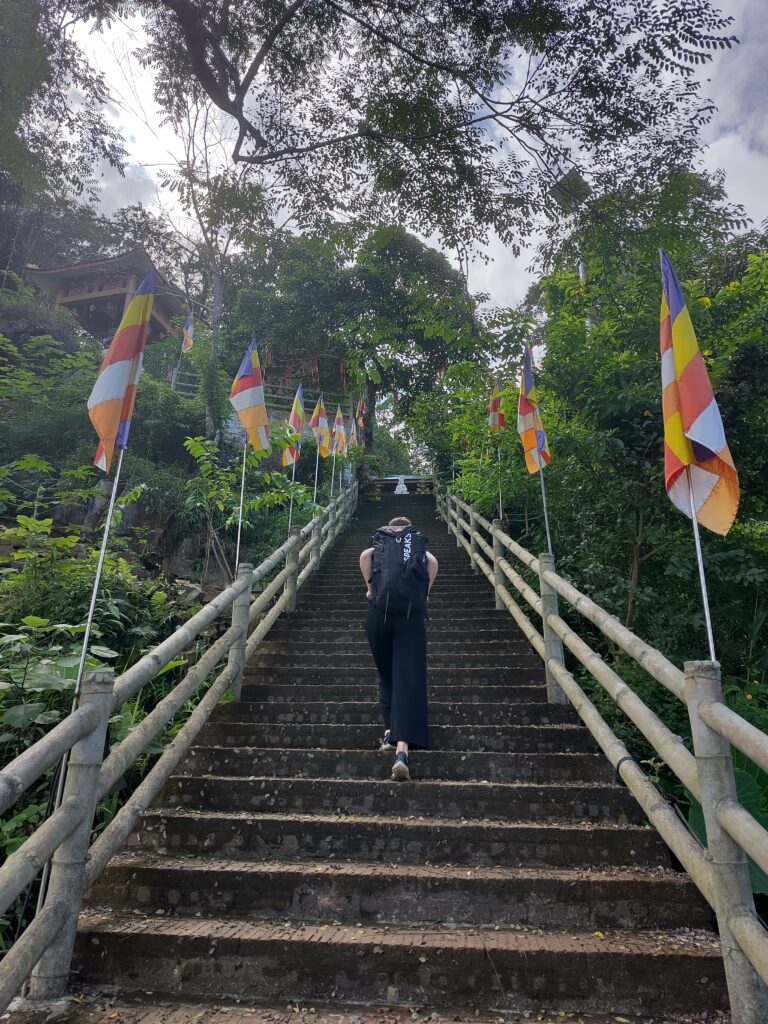 Nous continuons notre ascension en enchaînant les escaliers et nous arrivons au sommet du mont, encore plus trempes, mais on peut profiter d’une belle vue et de la fierté d’être en haut 🤩
