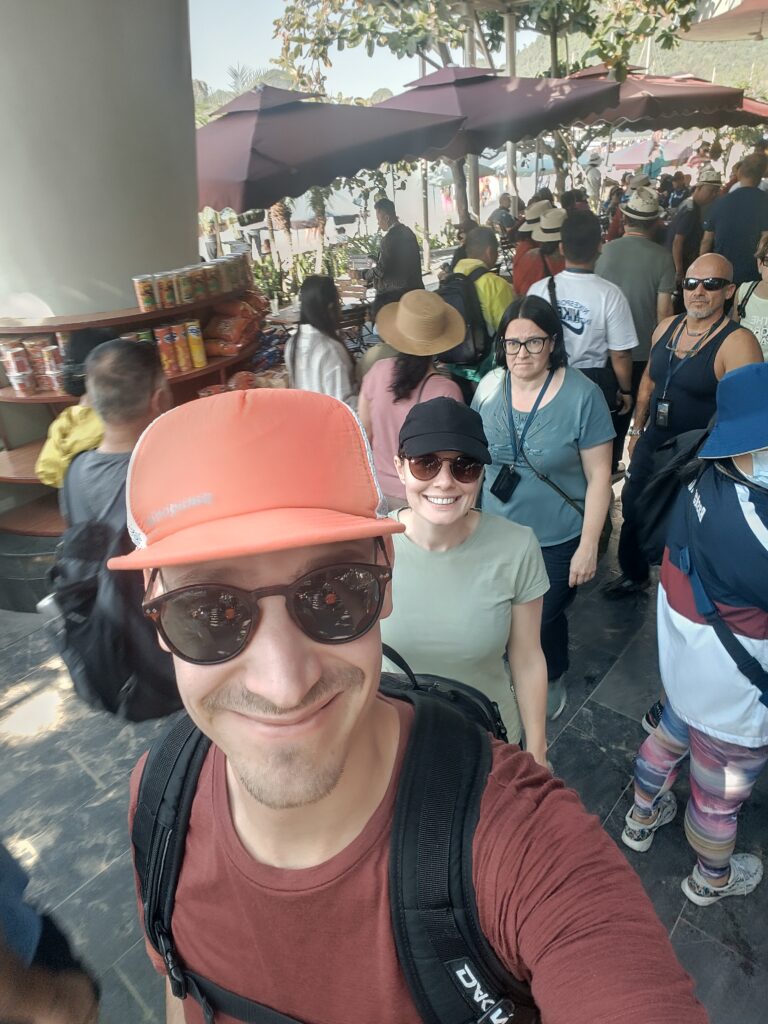 Nous continuons par un repas sur le bateau, avec des mets raffinés pour notre palais de bourgeois en croisière de luxe 🤣. Loïc fait preuve de courage et goûte des gigantesques crevettes avec une forme d’Alien. Désolé on a oublié de prendre en photo.
