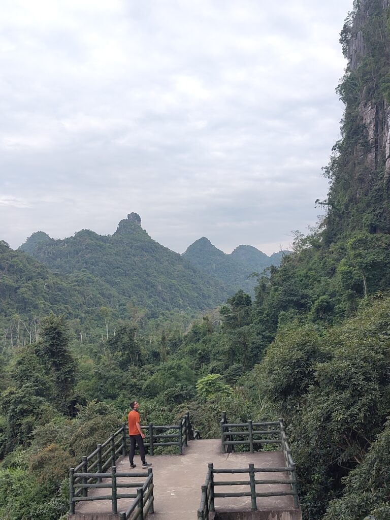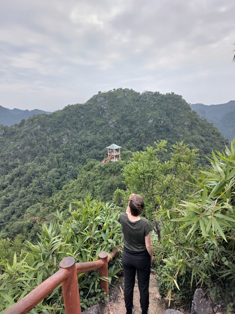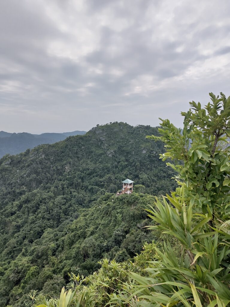 Hier soir, nous avons réservé un scooter pour aujourd’hui. Alors après une nuit prolongée pour se requinquer et un petit déj, nous nous mettons en route avec notre bolide automatique (on aura tout conduit comme 2 roues) vers l’intérieur des terres de l’île de Cat Ba. Après un petit tour à volontairement se perdre dans la campagne, nous nous dirigeons vers le parc national de l’île, qui couvre la majorité du territoire. Dans ce parc, on trouve des singes sauvages très rares, mais nous serions bien naïfs de penser pouvoir les croiser. Nous commençons par une ascension dans la forêt où il fait très humide, et nous nous hissons au sommet pour profiter de la vue sur le parc et sa forêt dense et intacte.