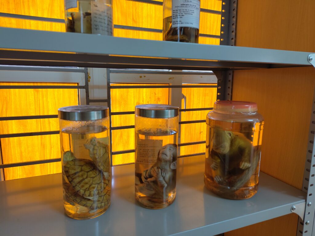 En revenant, nous passons devant un bâtiment où des specimens sont exposés. C’est assez glauque et l’état de l’expo est… vintage, tout au plus ? Parfois c’est drôle, parfois affligeant, parfois dégoûtant.