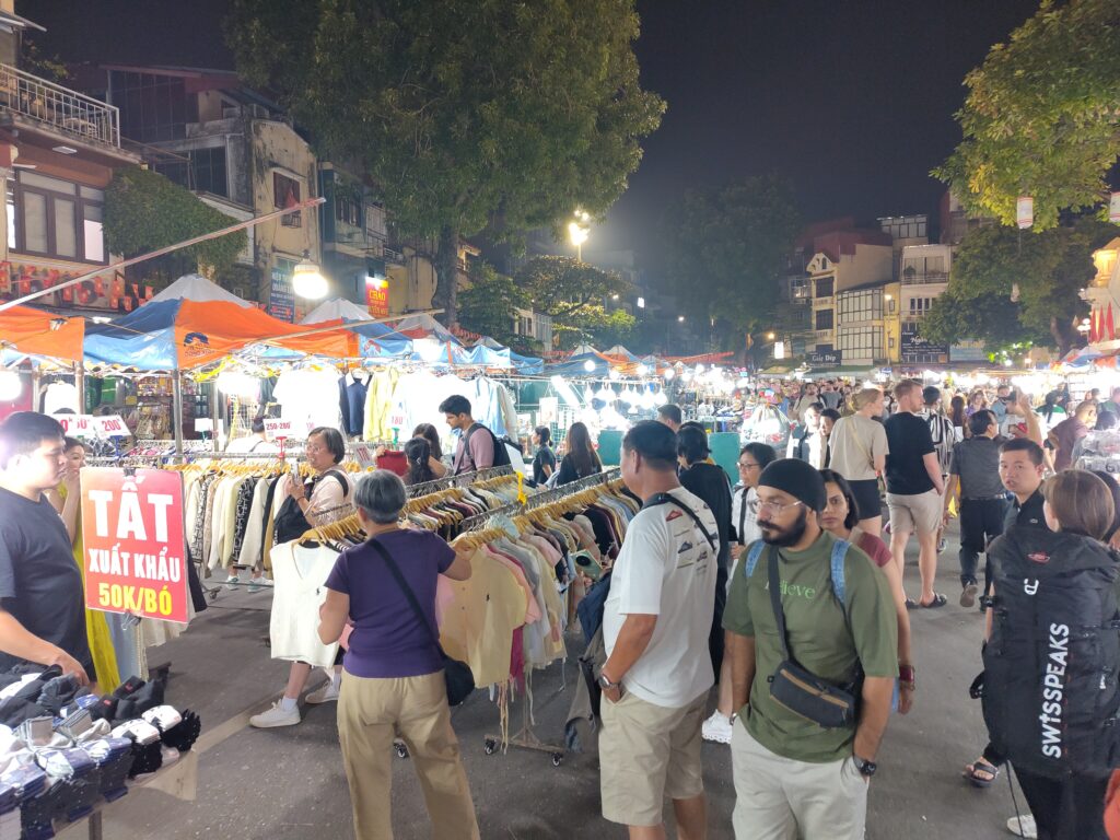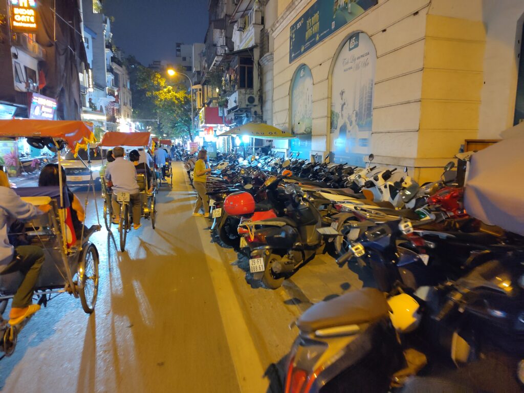 Dès qu’on s’approche de Hanoï… les bouchons. On saute du bus au premier arrêt et on fait un peu de marche dans la ville à la recherche de sandales pour le Laos car Loïc n’a que des baskets depuis qu’il a oublié ses tongs dans un des BnB 🤣.