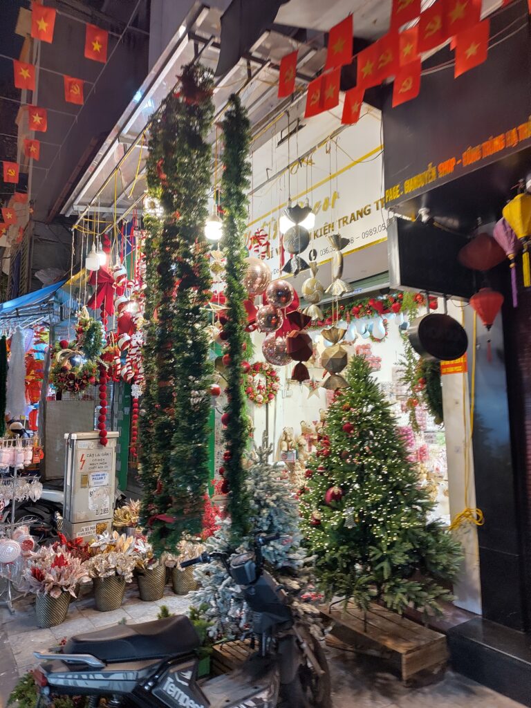 En cherchant un endroit accessible pour un taxi voiture dans la jungle urbaine, on passe devant des boutiques rigolotes comme celles qui vendent des fleurs en plastique sur une rue, et celles de la rue d’à côté qui vendent des décos de Noël, alors qu’ici il y a presque pas de chrétiens. C’est juste commercial.
