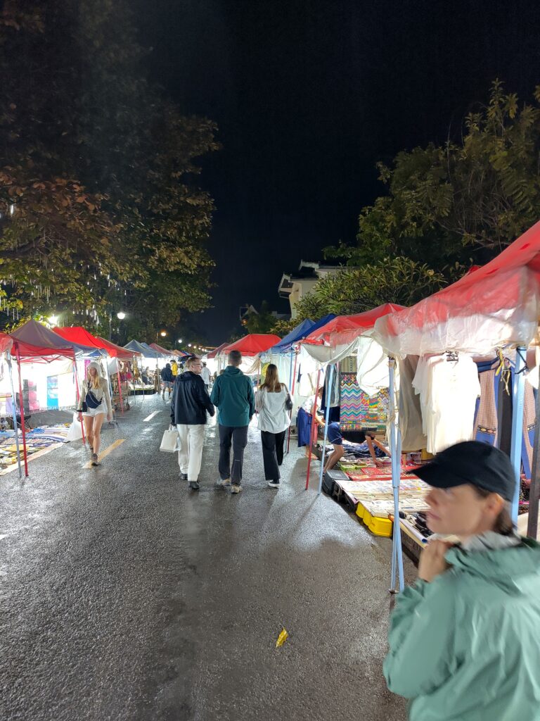 ensuite nous revenons dans la rue principale qui désormais accueil plein de stands qui se montent lorsque la nuit tombe. Et ici aussi, une différence notable avec Hanoï : c’est pas que du plastique ! Le Laos et en tout cas la ville de Luang Prabang semble avoir été plus malin sur ce coup-là que le Vietnam. Les magasins et les stands de marché vendent des produits qui semblent vraiment fabriqué ici et il y a beaucoup d’initiatives pour conserver la richesse culturelle et artisanale de la région.