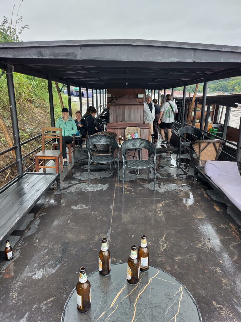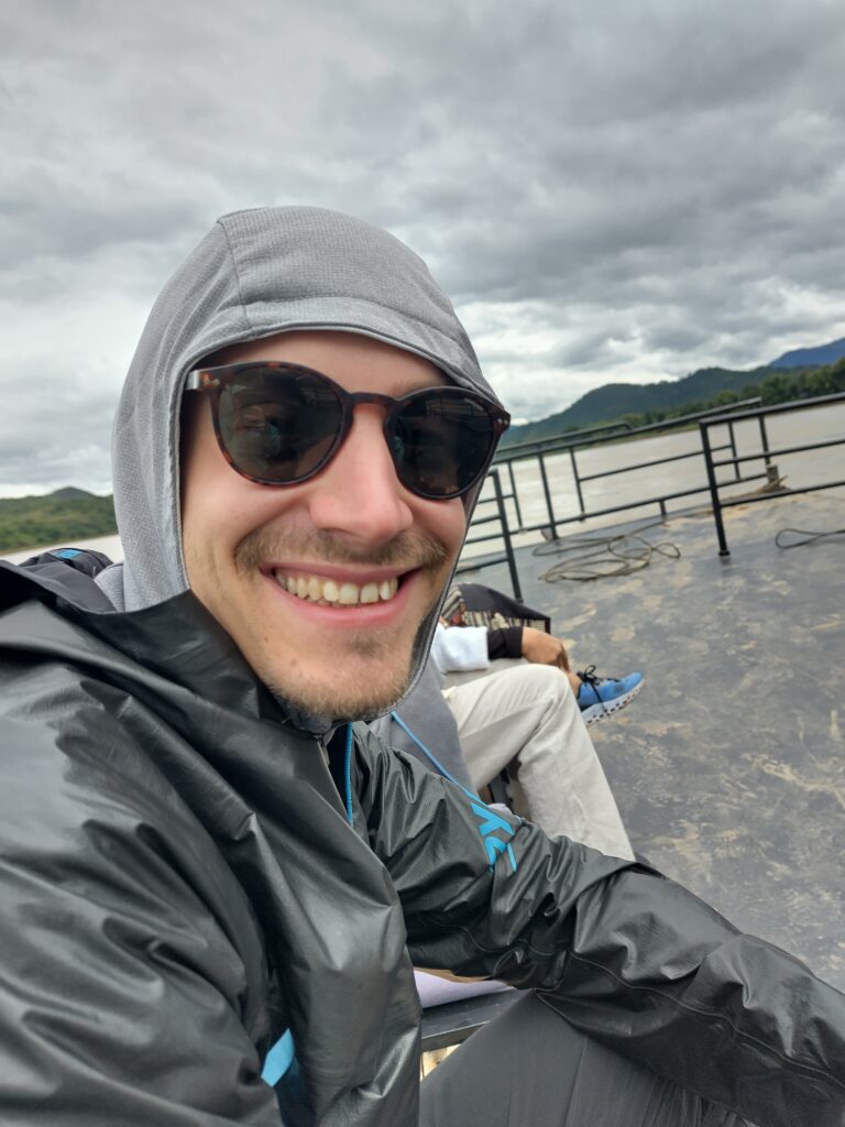 Au programme, nous allons faire du bateau sur le Mékong jusqu’aux grottes de Pak Ou, en passant par un village du whisky, et ensuite prendre un bus pour manger dans un parc de sauvegarde des éléphants et finalement visiter les chutes d’eau de Kuang Si. Ici les distances ne sont pas très grandes mais par contre c’est la galère pour se déplacer. Sur le Mékong, le bateau remonte le courant lentement et on fait 25 km en 2h. Quand on continue avec le bus, les routes sont très endommagées, il y a des nids de poules partout, et du coup faire 30 km prend une heure. Ça c’était pour le contexte 😊.
