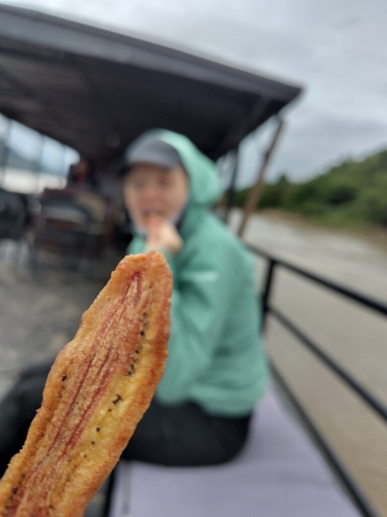 La croisière s’amuse et on déguste des chips de banane 😋 (une vraie tuerie) tout en profitant de la vue sur les rives du Mékong.