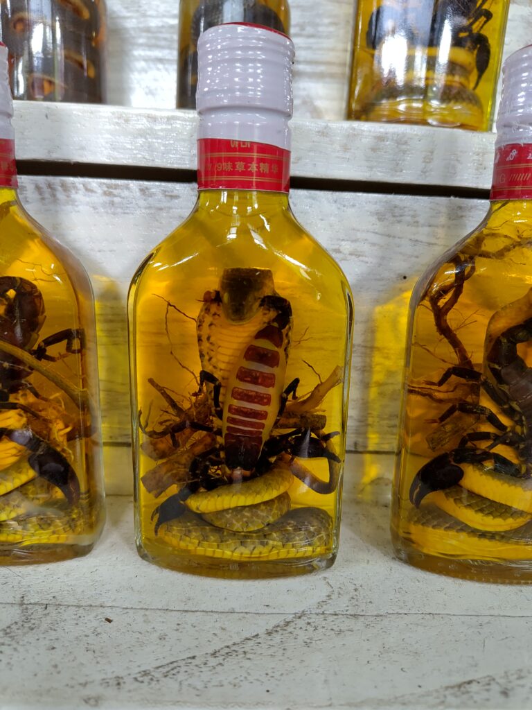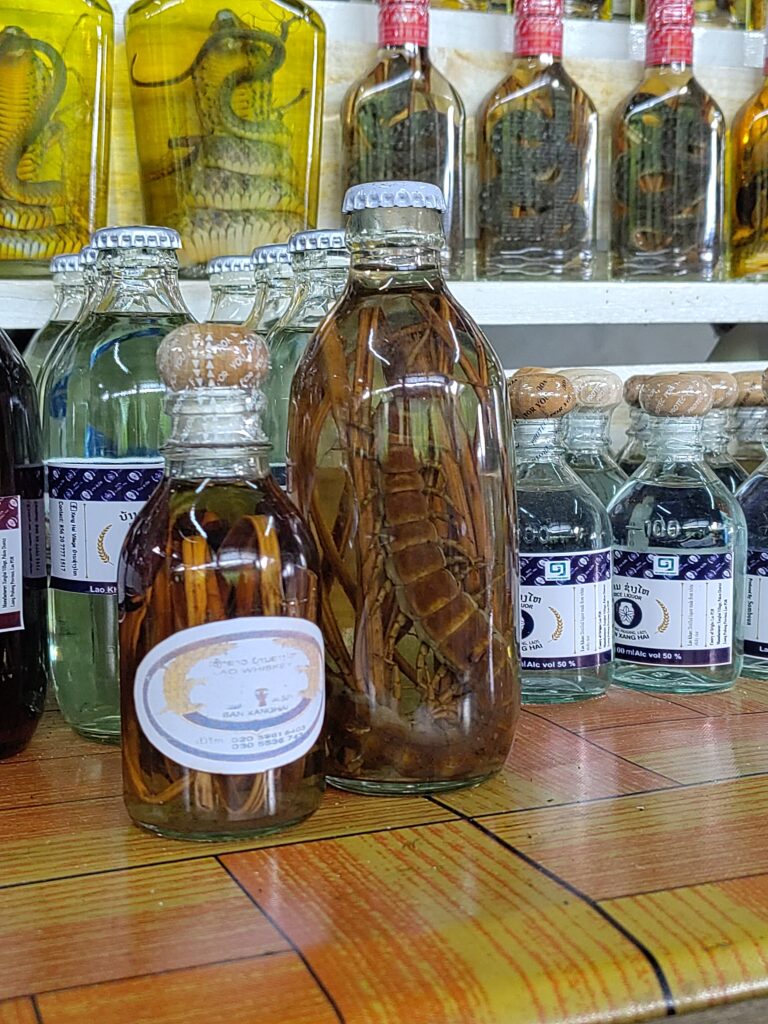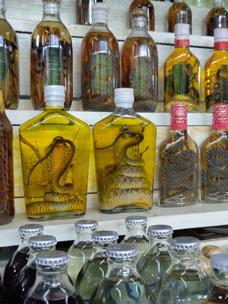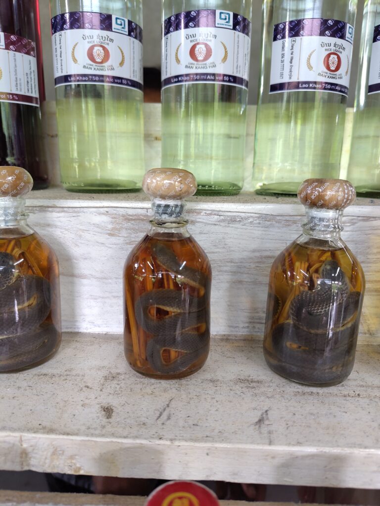Après 1h de ballade nous arrivons au fameux village du whisky, comprendre une bicoque en bois avec des bouteilles à déguster 😋. On nous explique comment est fabriqué le vin de riz et l’alcool de riz. Il y a des flacons qui contiennent des vrais mille-pattes (des gigantesques machins) – pour l’arthrite. Il y a d’autres flacons avec des serpents, et encore d’autres avec des serpents qui mangent des scorpions, c’est un truc de dingue 😂 ! Bien sûr le truc de grand malade c’est pour la virilité…