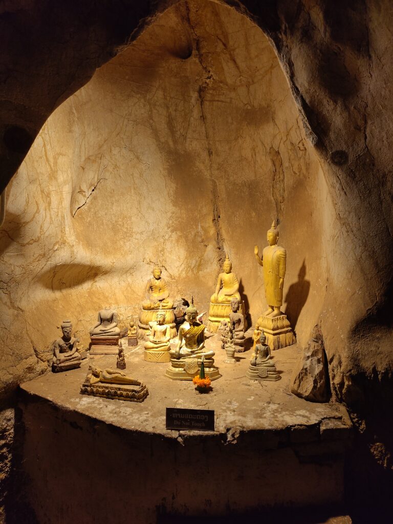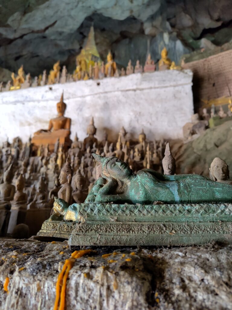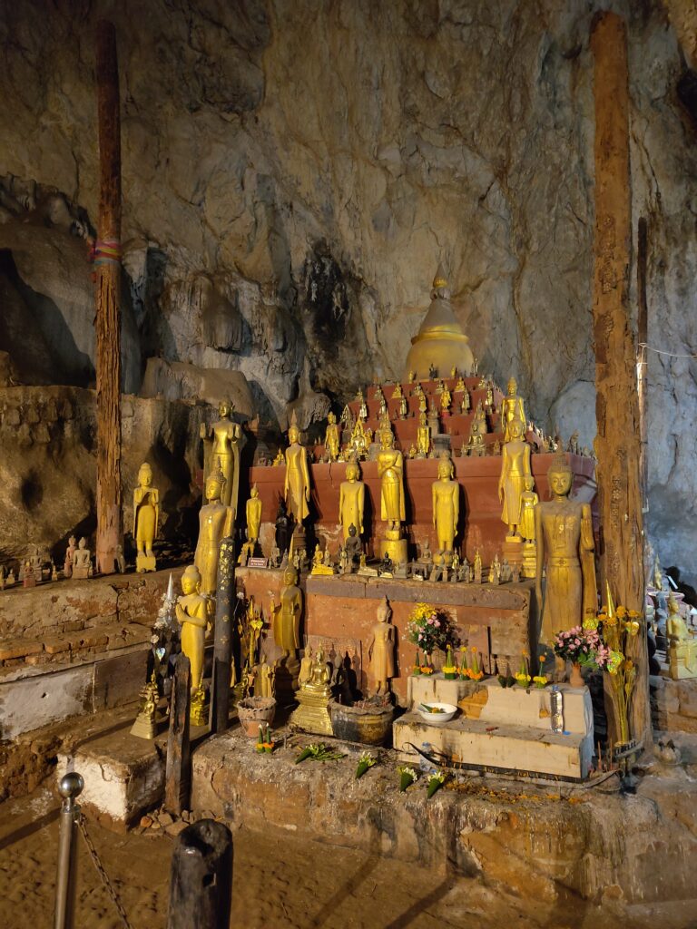 Après une autre heure, nous faisons une halte aux grottes de Pak Ou, qui sont connues pour leurs milliers de statues de Bouddha qui décorent 2 grottes. Ce sont des offrandes des croyants donc leur nombre augmente chaque année.