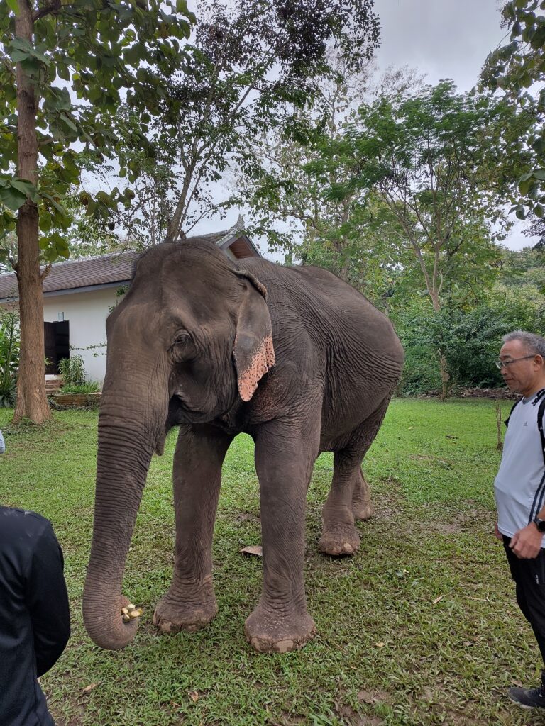 Nous remontons dans le bâteau pour traverser le fleuve et manger au sanctuaire des éléphants. Nous on se demande si c’est pas un zoo attrape-touristes, mais il semble que non, ce soit assez bien pour les animaux. Il y a un éléphant dans le grand parc où nous mangeons qui se tape son meilleur casse-croute de l’année à coup de bambous.