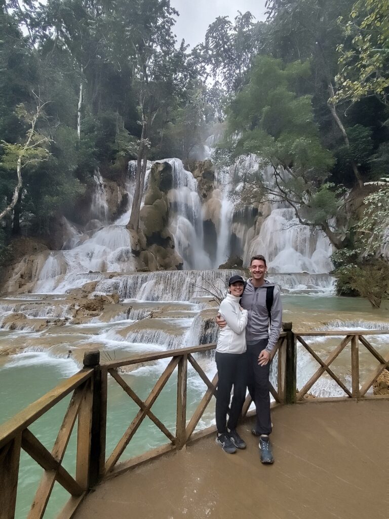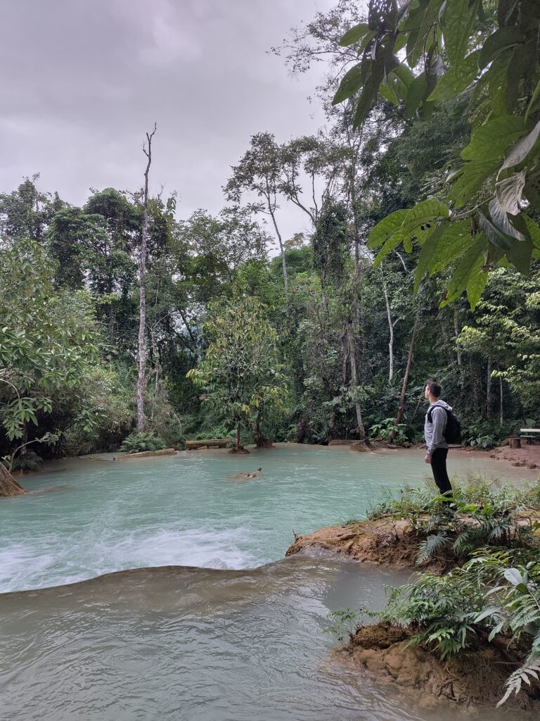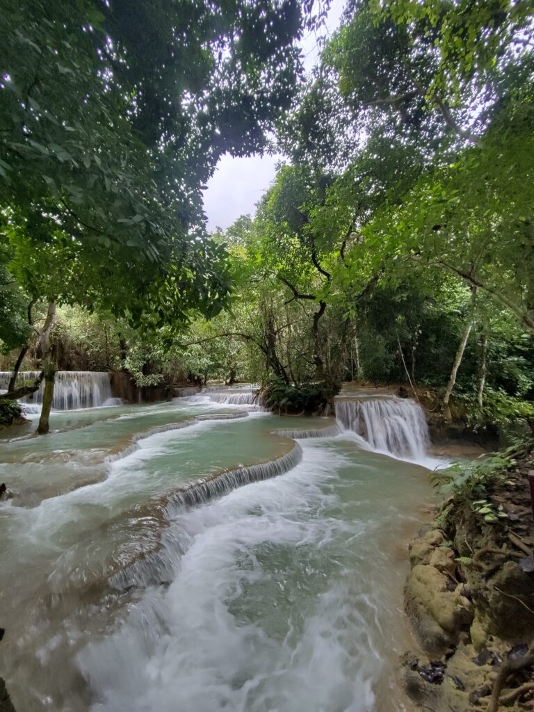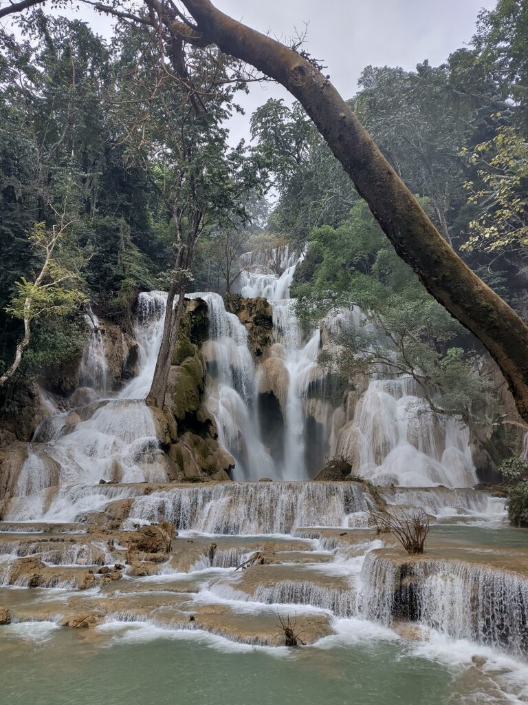 L’après-midi nous montons dans un minibus qui passe par des routes moins pavées les unes que les autres, on fait le grand huit à l’arrière ça secoue et le coca que l’on essaie de boire perd tout son gaz 😂. C’est comme ça pendant 1h30 et enfin nous arrivons aux fameuses chutes d’eau de Kuang Si, qui sont vraiment magnifiques. Il faut juste passer outre les centaines de chinois qui crient partout et bousculent tout le monde. Sur Nos photos on voit personne car nous sommes des professionnels.