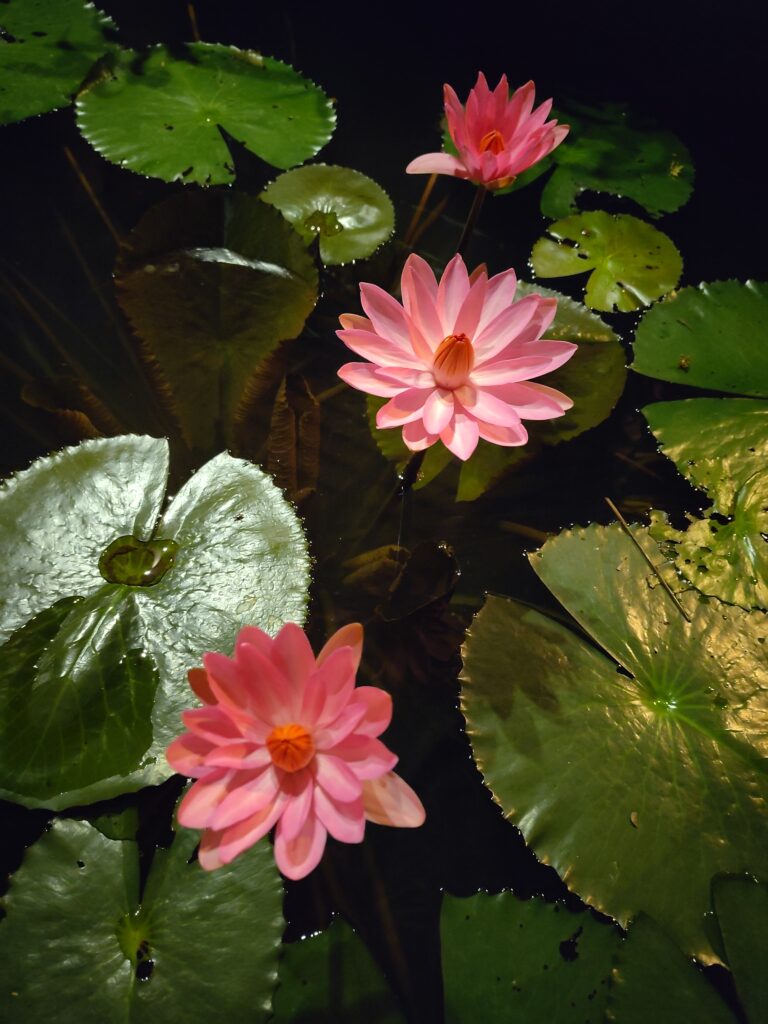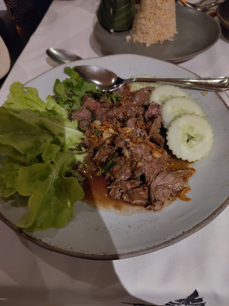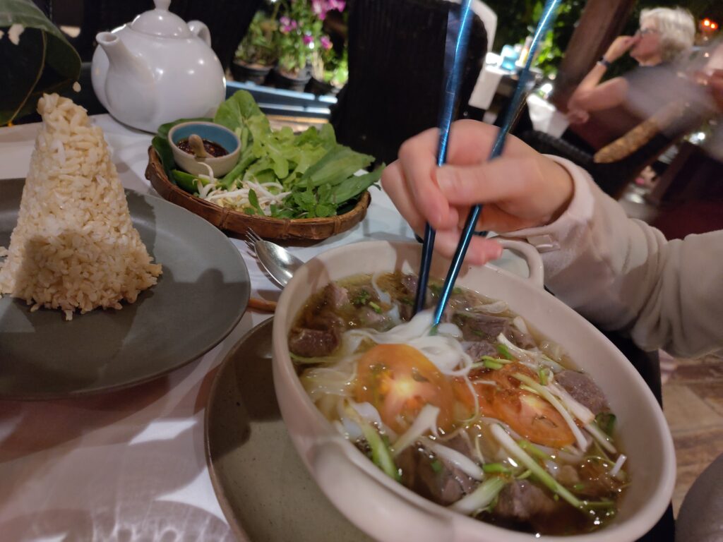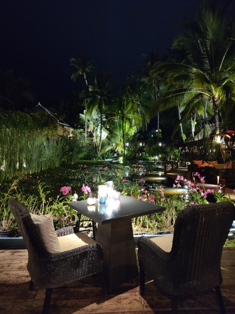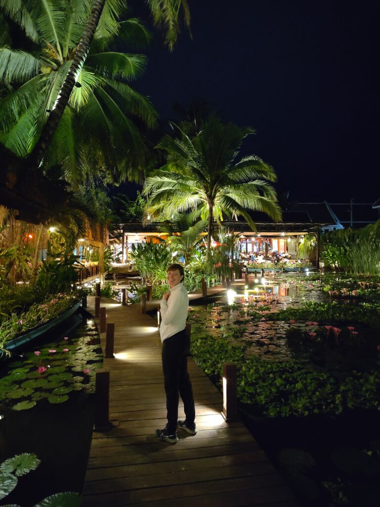Et comme on est toujours autant masos, on sort du bus non pas à notre hôtel mais au marché de nuit (que l’on a déjà traversé 3-4 fois) pour faire la route à pied, puis quand on arrive à l’hôtel, le temps pour une douche et on repart pour retraverser la ville, le marché de nuit pour la 5ème fois, et revenir au restaurant qui n’était pas libre hier. C’est très chic. Le cadre est incroyable et les prix exorbitants pour le pays, mais pour nous ça reste le prix d’une pizza. Devant nous des bassins de nénuphars classés à l’Unesco.