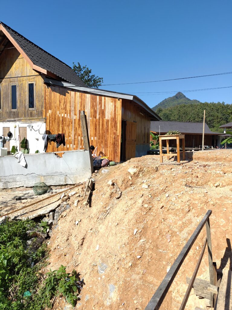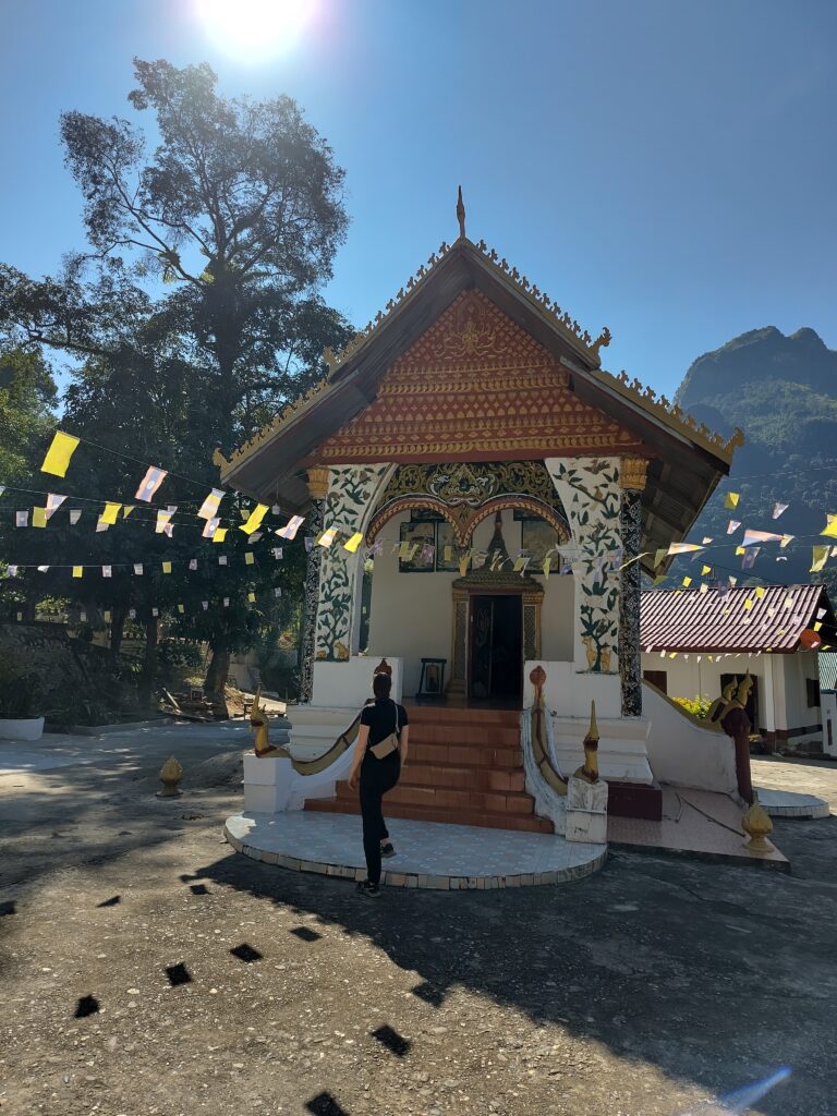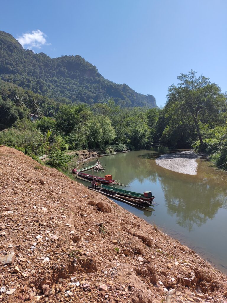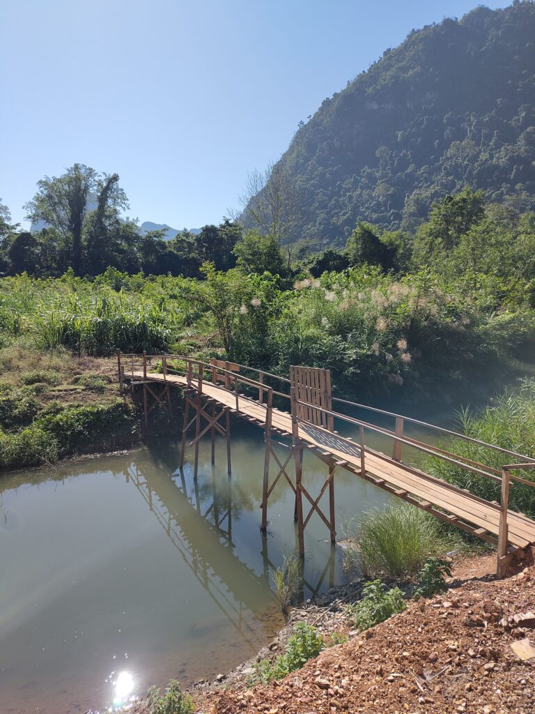La mémé nous regarde… On lui dit : « Cave ? » (Grotte en anglais pour les bilingues) Elle se lève et va chercher chez elle 2 billets avec un prix dessus (30’000 kip = 1 chf). On paie et voilà, on a résolu le mystère… Maintenant elle nous indique le pont 😄