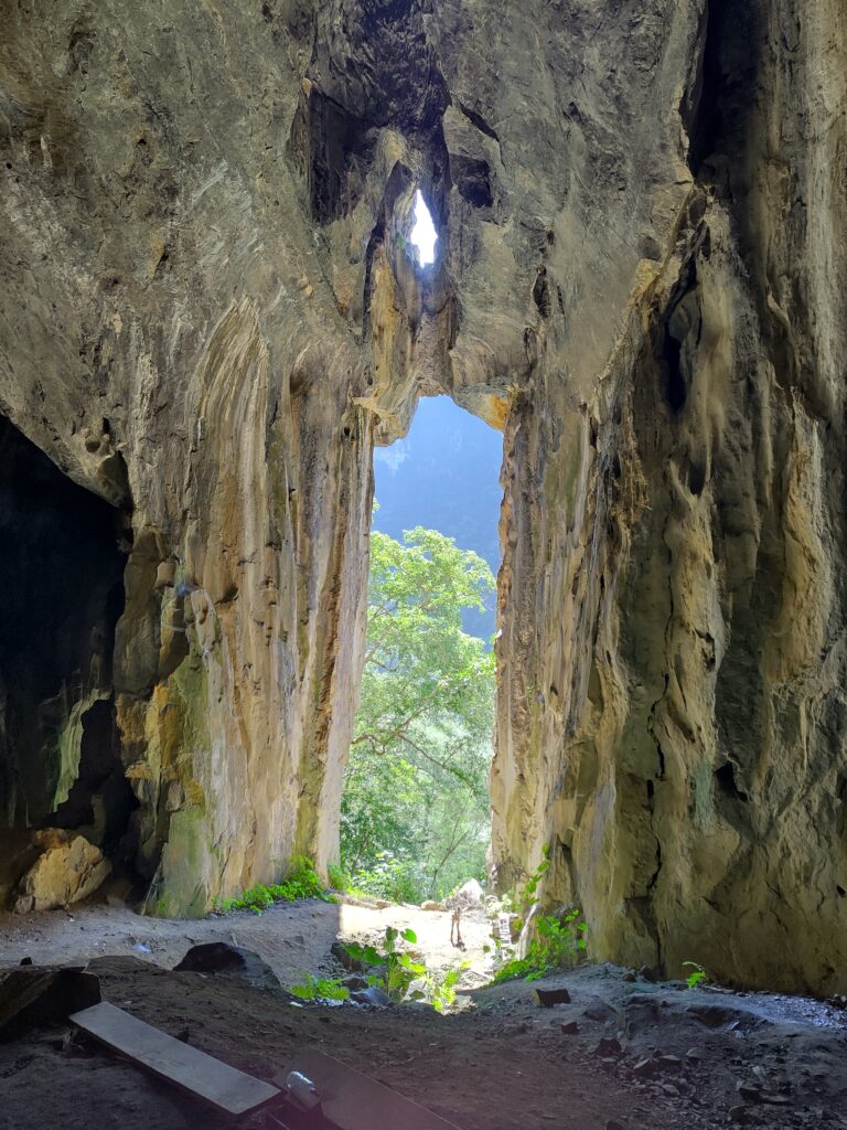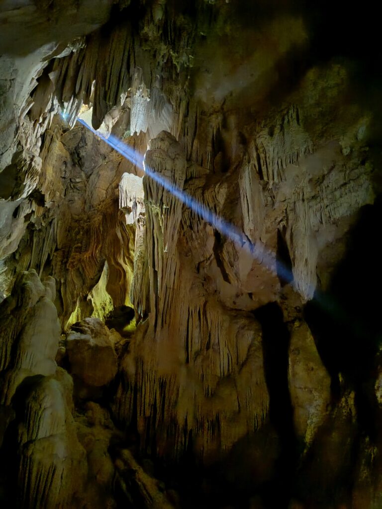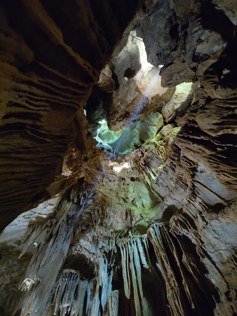 Nous arrivons assez rapidement devant l’entrée d’une grotte, mais pas de lumière. Bon, ben on va utiliser la lampe torche du téléphone, et il y a un rayon de soleil qui pénètre depuis un trou dans la paroi. La grotte est magnifique avec un trou dans le plafond à plusieurs dizaines de mètres au dessus de nous.