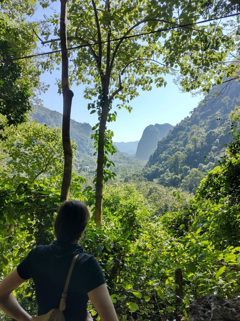 Pour la grotte, depuis la route principale on a marché un peu au hasard direction la montagne, puis on arrive vers un pont en bambou qu’on avait vu sur un commentaire Google. Devant le pont il y a une mémé qui tricote. On se demande un moment quoi faire, si on ose traverser le pont ?