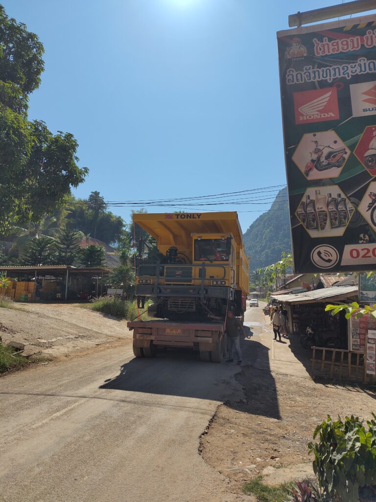 Nous revenons vers la moto, en passant dans la rue principale 2 énormes camions chinois tentent de passer sous les câbles électriques de la rue mais ça coince un peu.