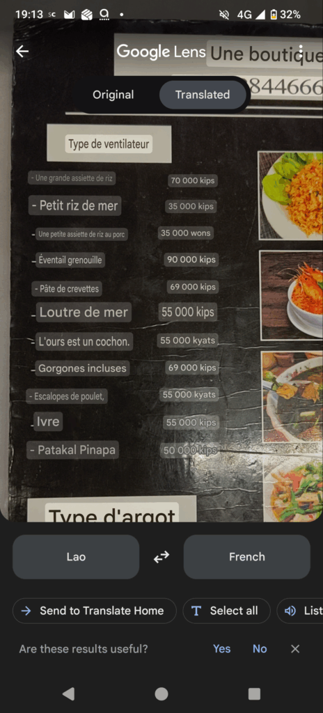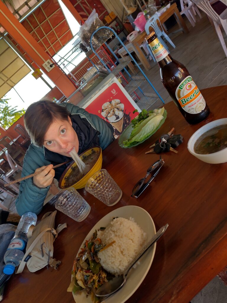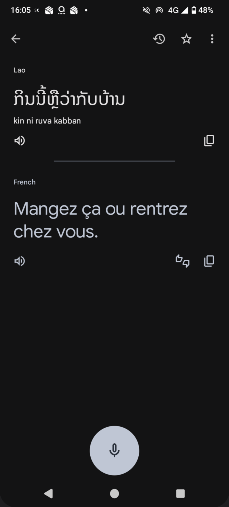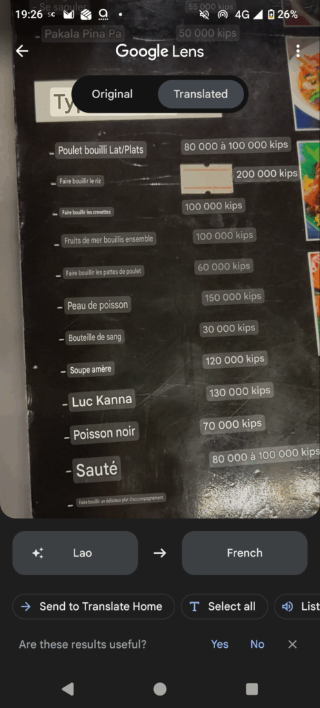Comme on a pas peur de l’aventure on décide d’y rester et on tente de traduire le menu en Lao avec Google. Un grand moment ! Alors, bouteille de sang, ça ne me dit rien comme type de ventilateur 😱