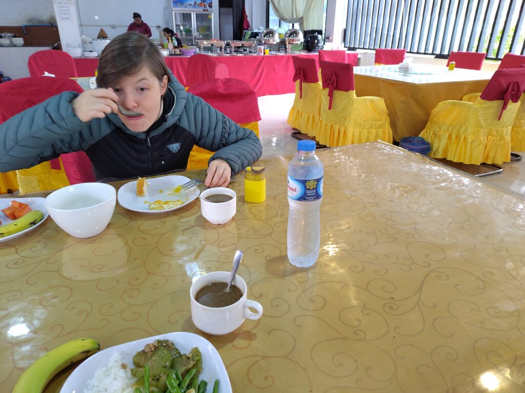 Nous nous méfions un peu du petit déjeuner qui nous attend, lorsque nous traversons la gigantesque place devant l’hôtel pour rejoindre le buffet dans un autre bâtiment. L’endroit est si Kitch, figé dans le temps comme le reste de l’hôtel. On croise des anglophones qu’on avait déjà vu au café hier. Quand je leur ai demandé ce qu’ils faisaient, ils m’ont dit faire le voyage à vélo depuis la Chine ! Courageux ces 2, car les routes c’est déjà pas drôle avec un moteur 🤣