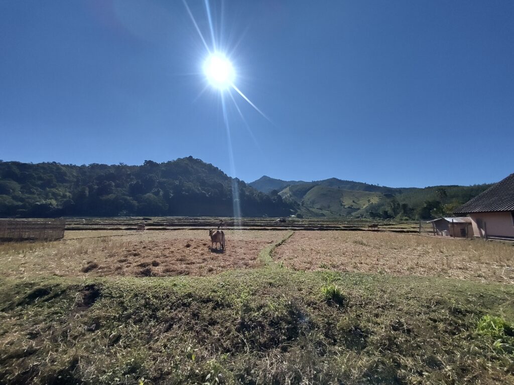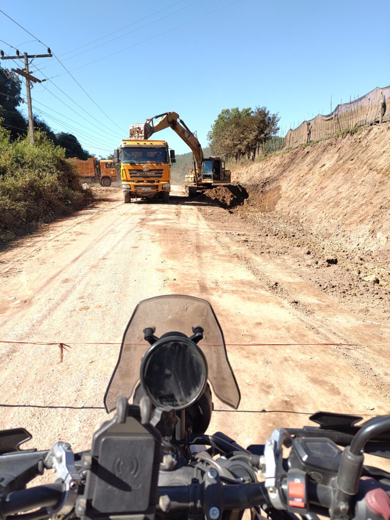 Après avoir quitté la ville, déjà les nuages se rarifient. On s’arrête à un stop pour cause de tronçon en construction 🚧. Il y a deux bonhommes qui font la circulation, tranquilles.