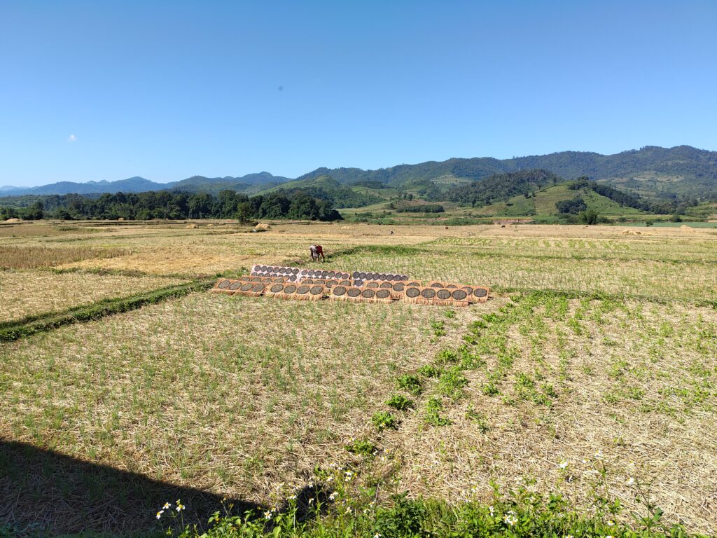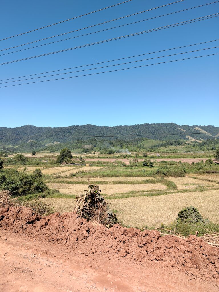 Nous continuons la route jusqu’à nous rapprocher du Mékong en suivant une rivière…