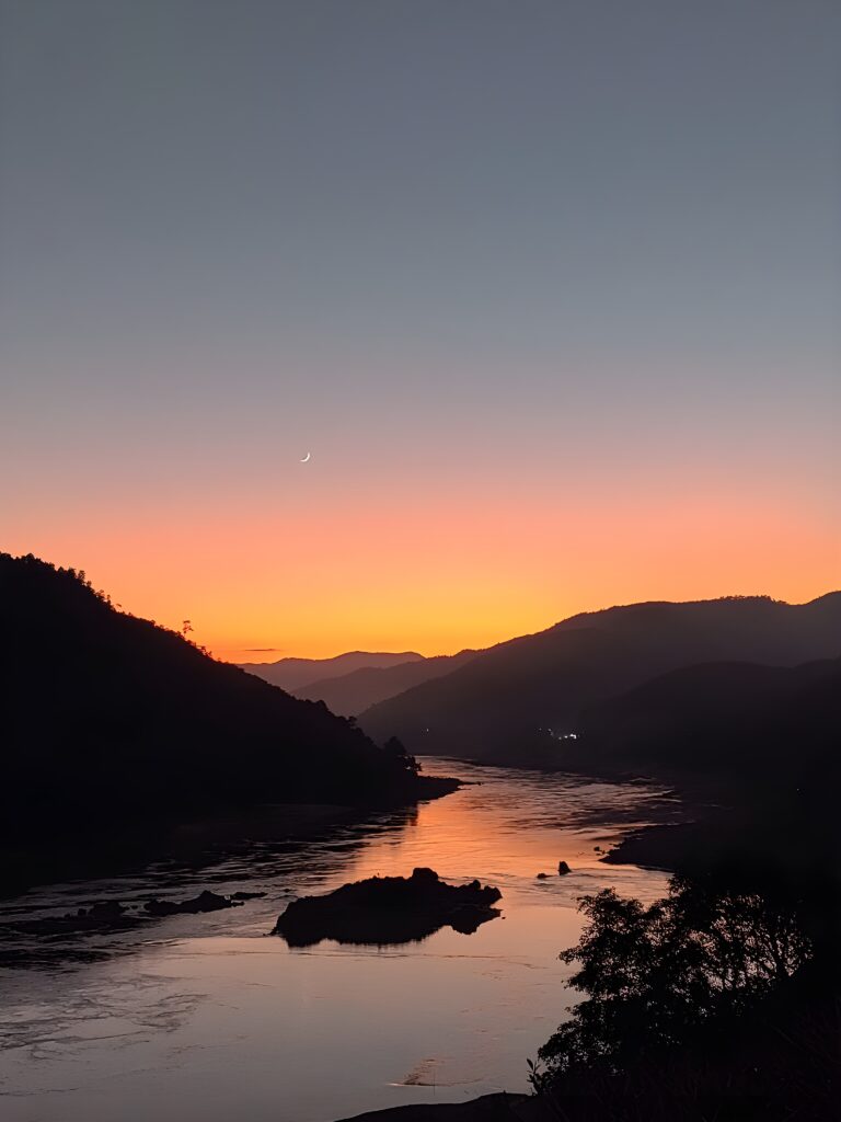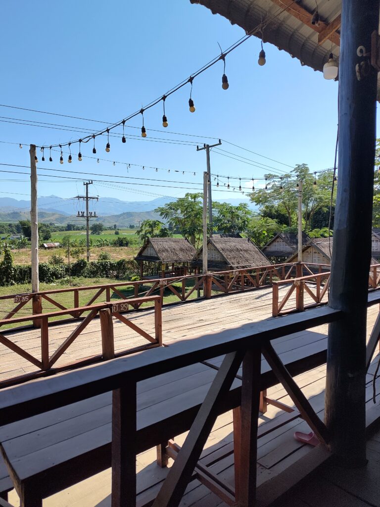 …et arrivons à Pak Beng, petit village au bord du fleuve. Il n’y a ici qu’un seul restaurant bien noté, et il se trouve que c’est celui de notre hôtel. Quand on voit la vue et le cadre on comprend pourquoi 😍.