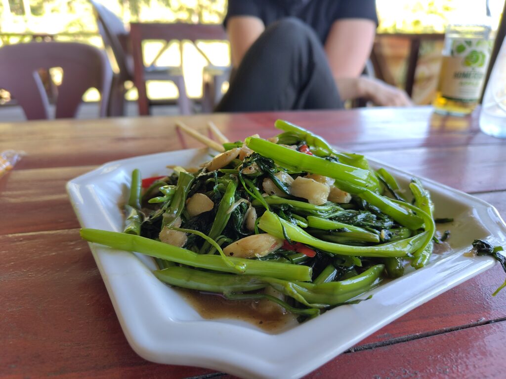 On opte pour la sécurité cette fois car le menu est encore en Lao seulement, alors on pointe du doigt la photo du riz au crevettes 😛 et des légumes sautés.