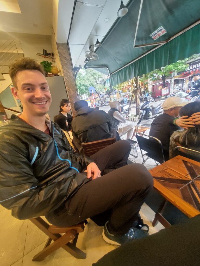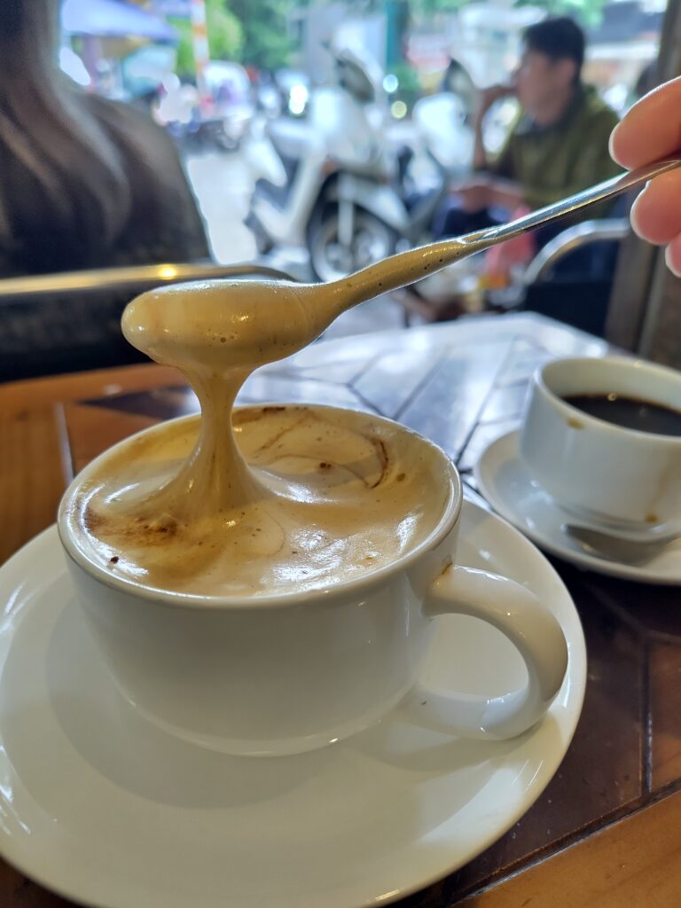 Ensuite direction le vieux quartier où ça grouille de vie et de scooter qui klaxonnent, bip bip ! Là on s’arrête pour prendre un café dans un boui-boui rempli de locaux, pour goûter une spécialité locale et incontournable pour les gros touristes : le café à l’oeuf. C’est un peu comme un tiramisu liquide, Loïc est ravi. Par contre les chaises font 20 cm 😂.