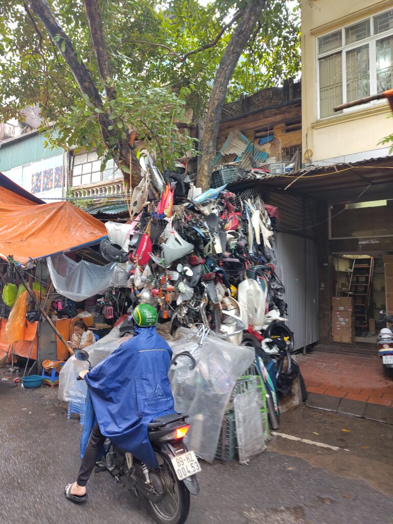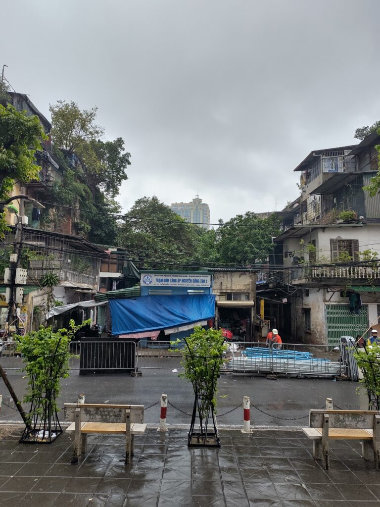 On ne sait pas trop par où commencer alors on va au lac Hoan Kiem, et notre guide ChatGPT nous explique l’histoire de la ville comme un guide interactif. On s’arrête dans un coin de rue pour acheter on-ne-sait-pas-quoi dans une feuille de bananier, et ce on-ne-sait-pas-quoi est très bon. Loïc tente bien de demander qu’est-ce que c’est, mais impossible car les gens ici ne parlent vraiment pas l’anglais.